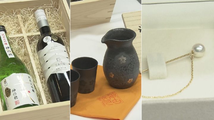 13日、各国に贈られる記念品が発表されました。地元の日本酒に、萬古焼の酒器セット、それに真珠を使ったアクセサリーなどがセットになっています。