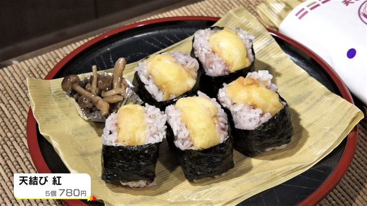 土鍋で炊き上げた自慢のご飯に、海老や海苔にもこだわって作った「天結び 紅」は、5個で780円。