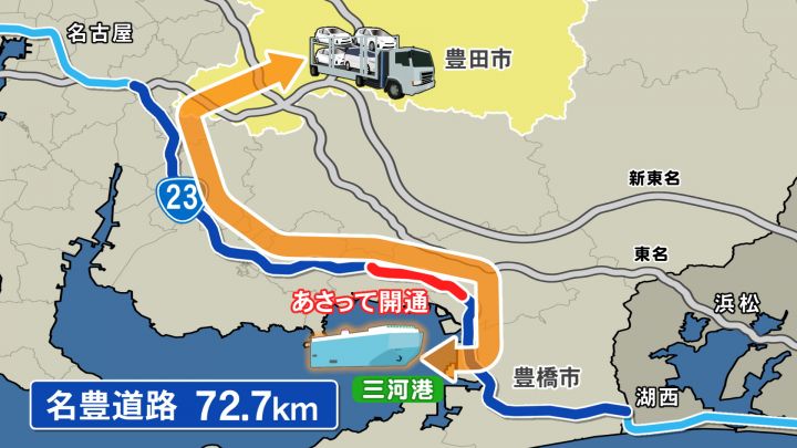 愛知県豊田市などで組み立てられた自動車を、名豊道路で三河港に運んで輸出する際に時間が短縮されます。