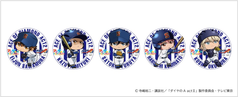 会場内アニゲーSHOPにて、『ダイヤのA actⅡ』アニメゲームフェス2020オリジナル缶バッチを会場先行販売いたします。「沢村栄純」「御幸一也」「降谷暁」「小湊春市」「奥村光舟」の5人の人気キャラクター描き下ろし!