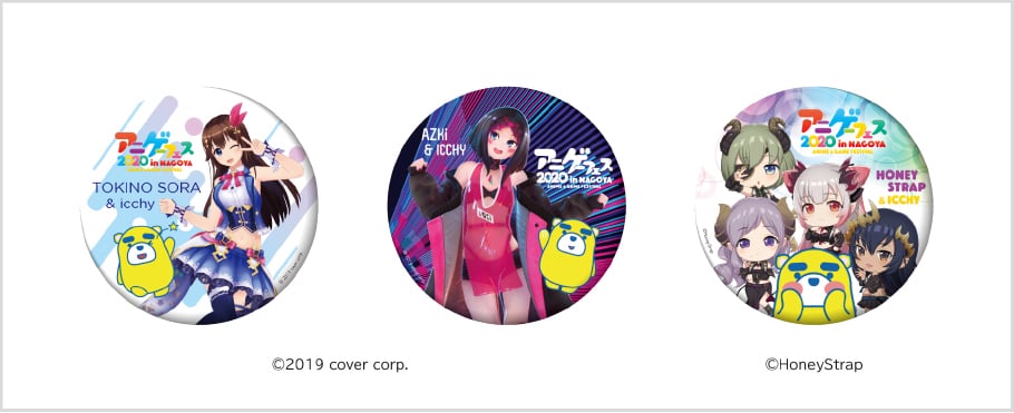会場内アニゲーSHOPにて、VTuber「ときのそら」「AZKi」「ハニーストラップ」と東海テレビのキャラクター「イッチー」がコラボした、アニメゲームフェス2020オリジナル缶バッチ & Tシャツを販売いたします!