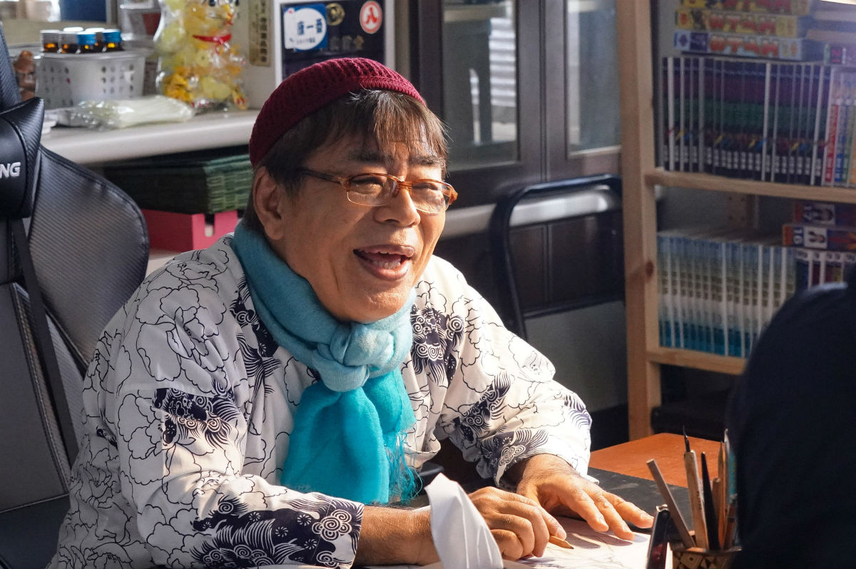 - 自分以外はみんな若いので(笑)、明るくて楽しい現場ですね。忘れられないのは、撮影が始まる前の3月頃に、工房のみんなで漫画を描く練習をしたときのこと。まだ寒かったし換気もしなければいけないから、僕なんかダウンを着込んで寒さに震えながらペンを握っていたんですよ。で、ふと隣を見たら佐竹学役の徳重(聡)くんがTシャツ一枚で描いていて。いやぁ、熱いなー、若いなー、筋肉の量が違うなーって、ちょっとビックリしたことを覚えています。