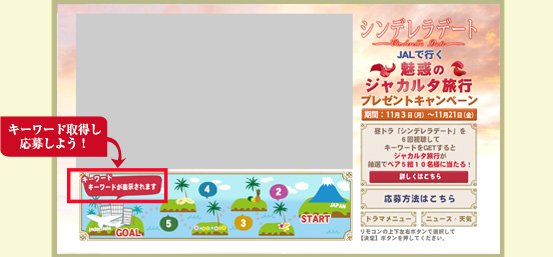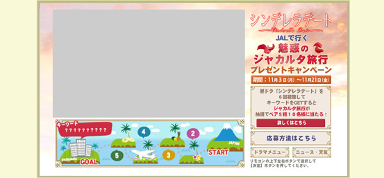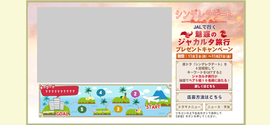 シンデレラデートのデータ放送では、『JALビジネスクラスで行く 魅惑のジャカルタ旅行 プレゼントキャンペーン』を実施しています。番組を見るとデータ放送画面の飛行機がGOALを目指して飛び立ちます!1日1マス進み、GOALに到着すると、応募キーワードが表示されますので、 応募方法をご確認の上、ご応募ください。 ご応募いただいた方から抽選で、ペア5組10名様にジャカルタ旅行をプレゼントいたします。
