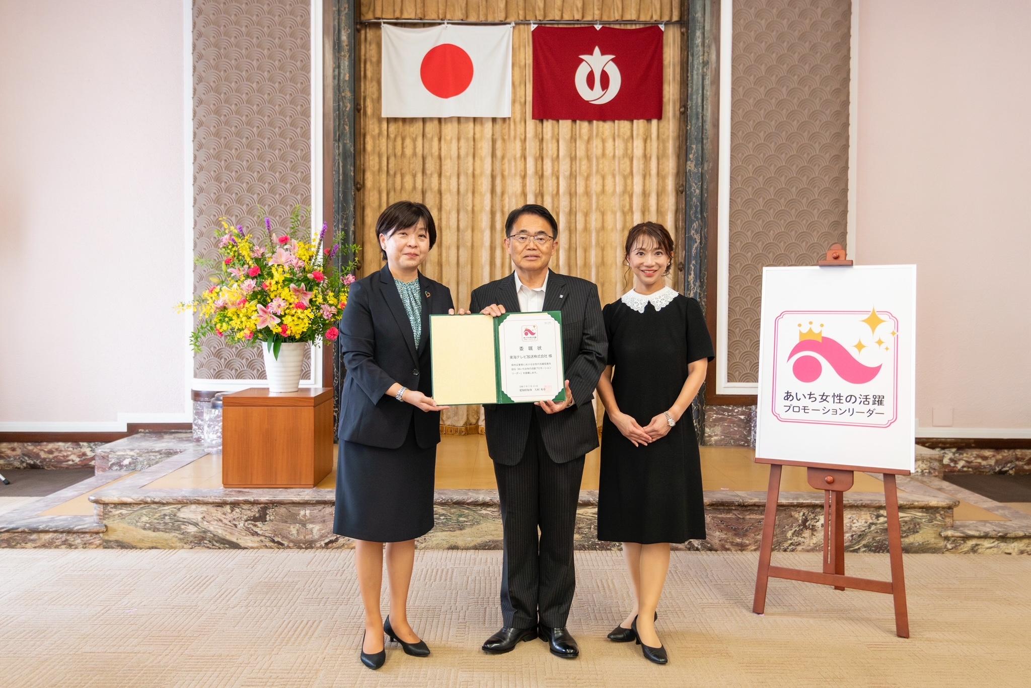 こうした取り組みが愛知県の定める基準を満たし、令和5年1月1日に「あいち女性輝きカンパニー」として認証されました。そしてこのたび、愛知県が進める女性活躍推進施策に協力する企業として、「あいち女性の活躍プロモーションリーダー」に委嘱されました。