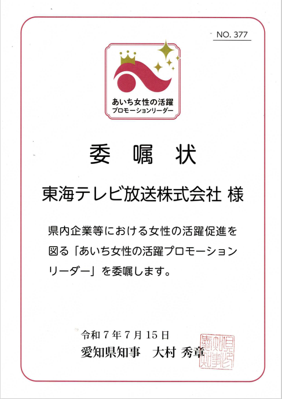 当社は、大村秀章愛知県知事より「あいち女性の活躍プロモーションリーダー」に委嘱されましたので、お知らせいたします。