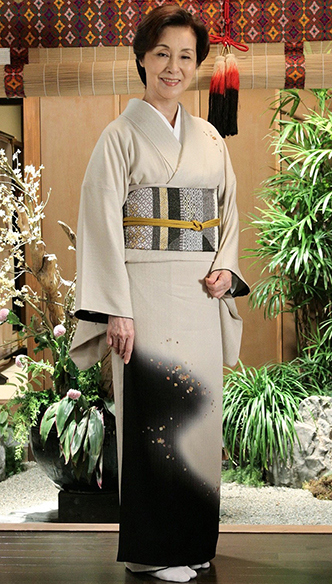 生地の地模様に紅梅七宝が織り込まれ、着たときにきれいに見える着物。伴治郎。