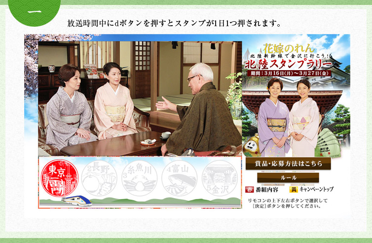2015年3月16日(月)~27日(金)の放送中に、テレビのリモコンのdボタンを押してデータ放送をごらん頂くと、画面上にスタンプが押されます。