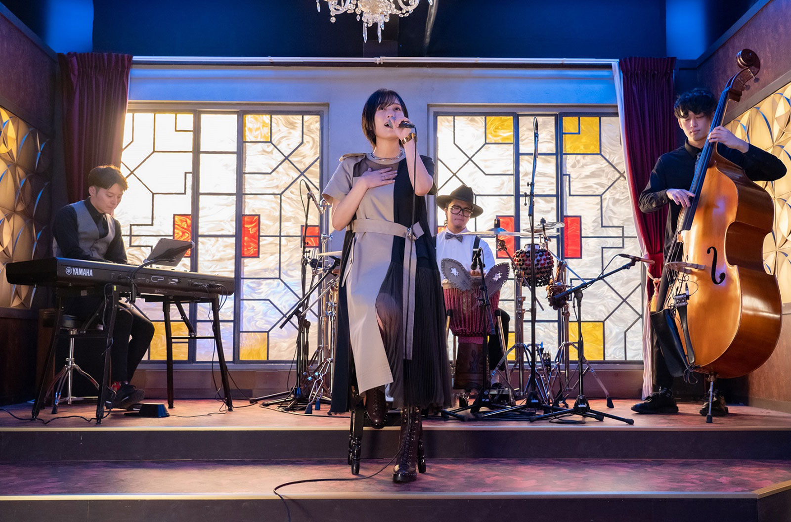 パーカッションやウッドベースなど、普段と演奏スタイルが違う中で歌唱させていただいたことです。また、ゴージャスな衣装はなかなか着る機会がないのですが、ドラマのセットと馴染みが良くて、BAR「OLD
