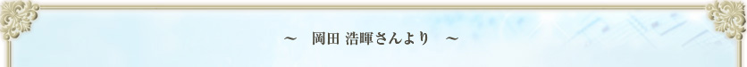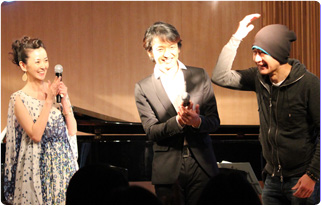 | いよいよ開演…。なんだか厳粛なだけに張りつめた空気はそのまま皆の緊張へと繋がります。 ピアノに当たる青い照明…ホールはまさしく「ブルームーン」に包まれました。 コーニッシュさんと弦楽隊4人が登場!真っ赤なシャツのコーニッシュさんと黒に統一された弦楽カルテットがステージ上の席に腰を下ろしました。いよいよ「青の月」生演奏が始まるかと思いきや!! 「音楽は感情だ!想いだ!」と、浩志の声! なんと客席後ろから在りし日の堤浩志(岡田浩暉さん)が登場したのです!客席からは悲鳴のような声が…。ドラマと同じ設定でセリフ言いながら客席中央へ…。 と呆気にとられていると今度は直の声!今度は手島直(高橋かおりさん)が登場。 「浩志…」何度も聞いたあのセリフに会場内は一気に「Xmasの奇蹟」一色へと変わってしまいました。 そして二人がセリフを言い終わるとステージでコーニッシュさんによる「青の月」の演奏が始まりました…。 その後もドラマの設定で直と浩志が「黄の月」「赤の月」を紹介してコーニッシュさんが演奏するというイベント構成。今回は弦楽隊が加わったことで聞きなれた月三部作も新たにバージョンアップしたイメージでした。 |