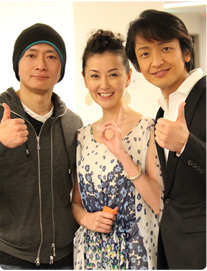 ここからは高橋かおり、岡田浩暉に戻ってコーニッシュ・藤本晶子(東海テレビアナウンサー)とトーク構成となりました。 その中で… ドラマ放送終了から2年を経過しての遅すぎる!?DVD発売に対し高橋さんは「ファンの熱い想いが届いたんですね…皆さんありがとうございます!」と集まったお客様に感謝の意を述べられました。 そして「Xmasの奇蹟」イベント恒例?高橋さんが「青の月(やさしめバージョン)」を演奏する流れに…。2年前、名古屋でのイベントの際演奏したことを受け「2年も経ったからかなり上達されたんですよね…」と藤本アナからもプレッシャーをかけられてしまう高橋さん…頑張って! すると…、なんと高橋さんはほぼパーフェクトで演奏されました!お見事!! そんなこんなで会場内もだんだんとヒートアップしてくる中、なんと一人の乱入者が…!? なんと大内厚雄さんではないですか!思わぬ人の登場に会場は一気にヒートアップ!「博人~!」歓声が飛び交います。 舞台公演中らしく稽古の合間に駆けつけてくれたという大内さん。背中にバックを担ぎニット帽を眼深に被った様相はちょっと怪しかったですけど、来てくれたことにみんなが大喜びでした。 |