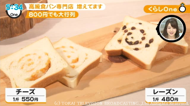 1番人気の「レギュラー」1斤330円や、大粒レーズンがたっぷり入ったもの、北海道産の「チーズ」など、5種類の食パンを販売しています。