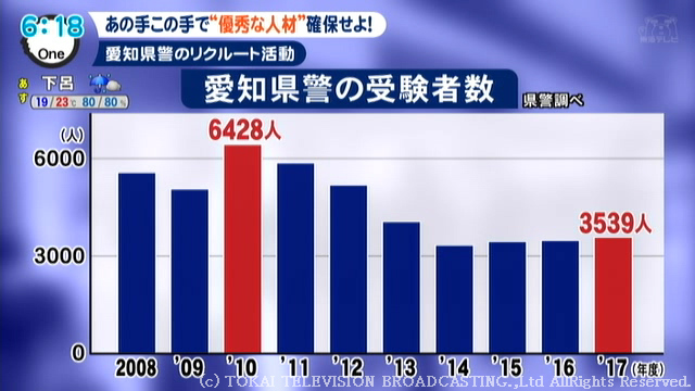 愛知県警では採用試験を受ける“受験者数”が減少傾向にあります。ここ10年の数字を見ると、2010年に6428人だったのが、去年は3539人となっています。