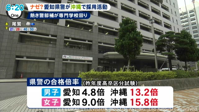 昨年度、高卒区分試験倍率では、男子で愛知が4.8倍なのに対し沖縄は13.2倍。また女子でも愛知が9.0倍に対し沖縄は15.8倍となっています。
