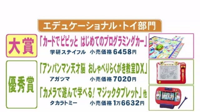 続いて、楽しく学べるおもちゃ部門、大賞は「カードでピピッと はじめてのプログラミングカー」(小売価格 6458円)。車の通り道を決めて、どんな命令を出したらゴールにたどり着けるか考えます。「まえ」「うしろ」「右」などカードの情報を読み込ませ実際に車を走らせて遊びます。