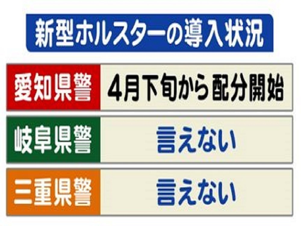 このホルスターの東海地方の警察への導入状況、愛知県警はすでに4月下旬から導入されています。岐阜県警と三重県警については「導入状況は言えない」としています。