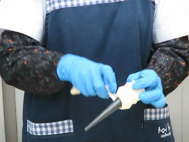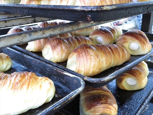 焼きあがったら、冷ましながら1つ1つ円錐型を生地から外し、パンが冷めたところでクリームを詰めます。この一連の作業は、すべて手作業です。