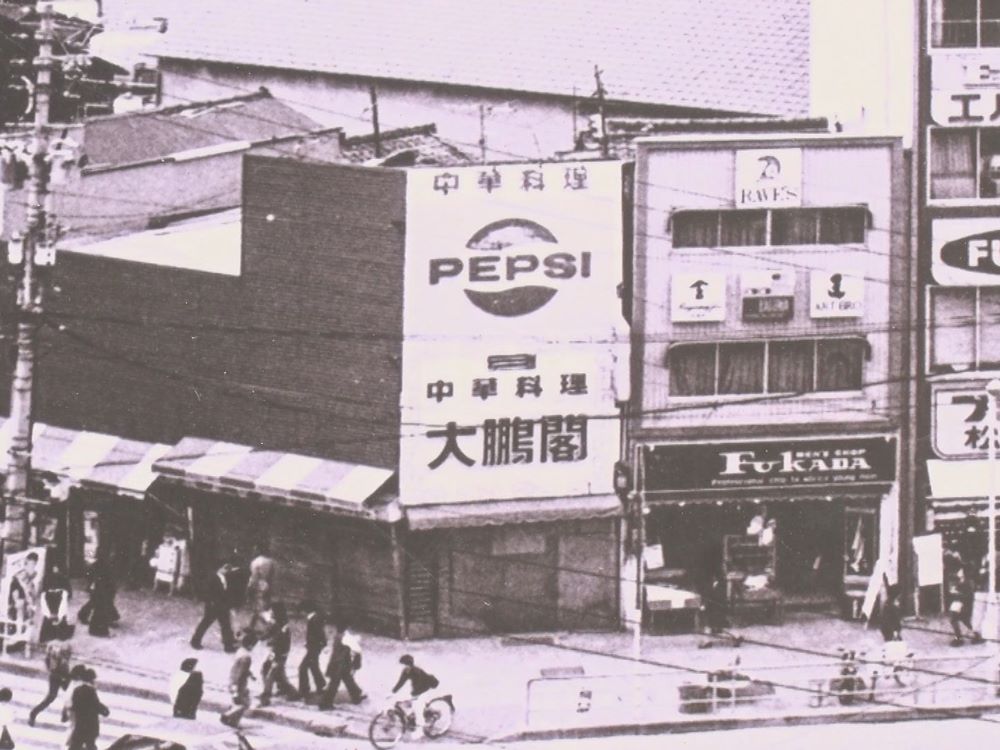 モノクロの写真を見ると、当時この交差点に「大鵬閣」という名の中華料理店があったこともわかりますが、今はもうありません。