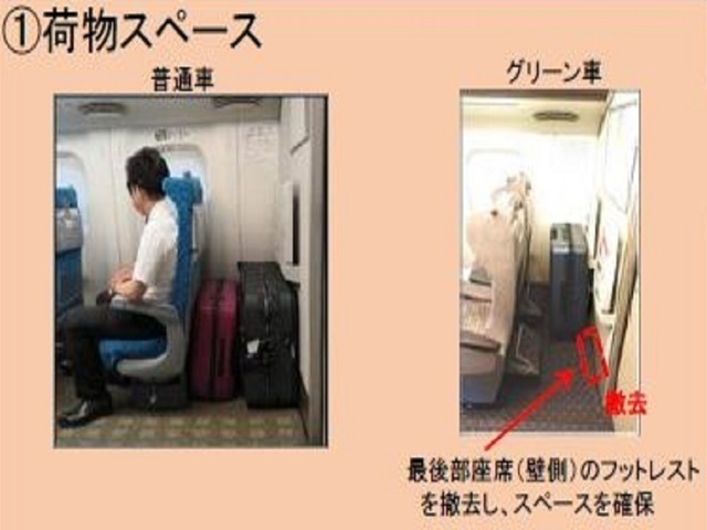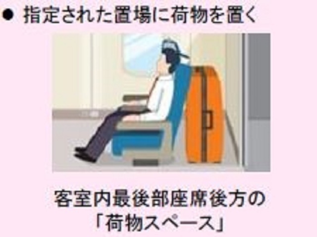 特大荷物が置かれるのは、「荷物スペース」と「荷物コーナー」です。ひとつは、普通車・グリーン車ともに、各車両の最後尾の座席の後方にあるスペースが来年5月中旬の乗車分から「荷物スペース」となります。