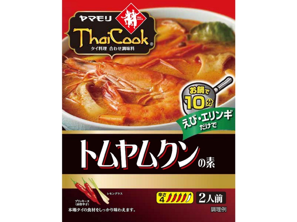 ヤマモリの新商品「タイクック トムヤムクンの素」は、鍋にトムヤムクンの素と水を入れて、エビとエリンギを加えて煮込み牛乳を入れて完成、調理時間は約10分。価格は税込みで216円です(内容量90グラム)。
