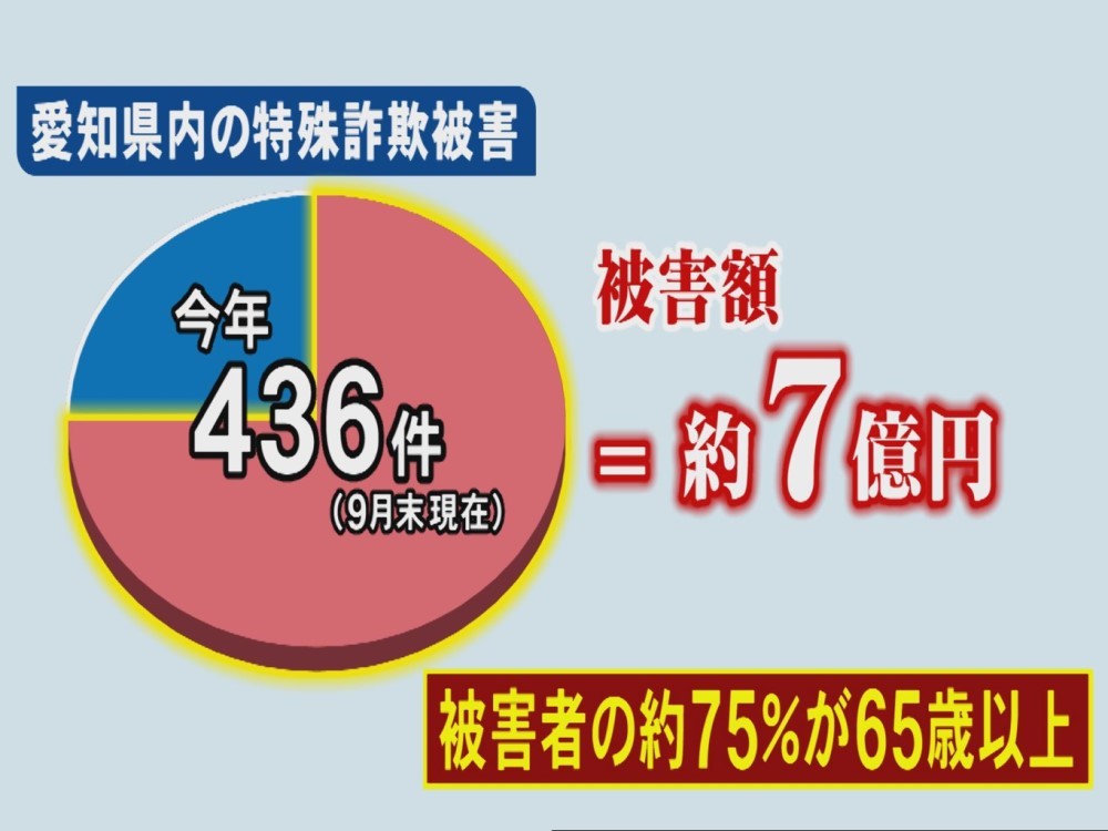 愛知県警によりますと、県内の特殊詐欺被害は、今年に入り436件(9月末現在)。被害額はあわせて7億円にのぼり、このうち65歳以上の高齢者が被害者の約75%を占めています。