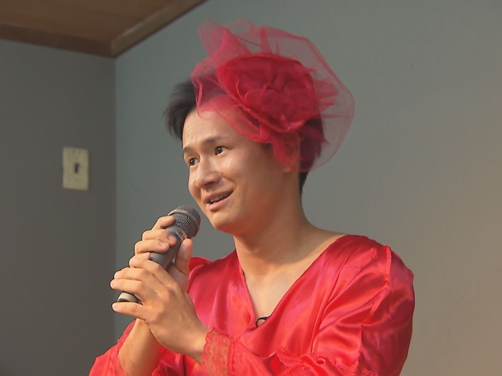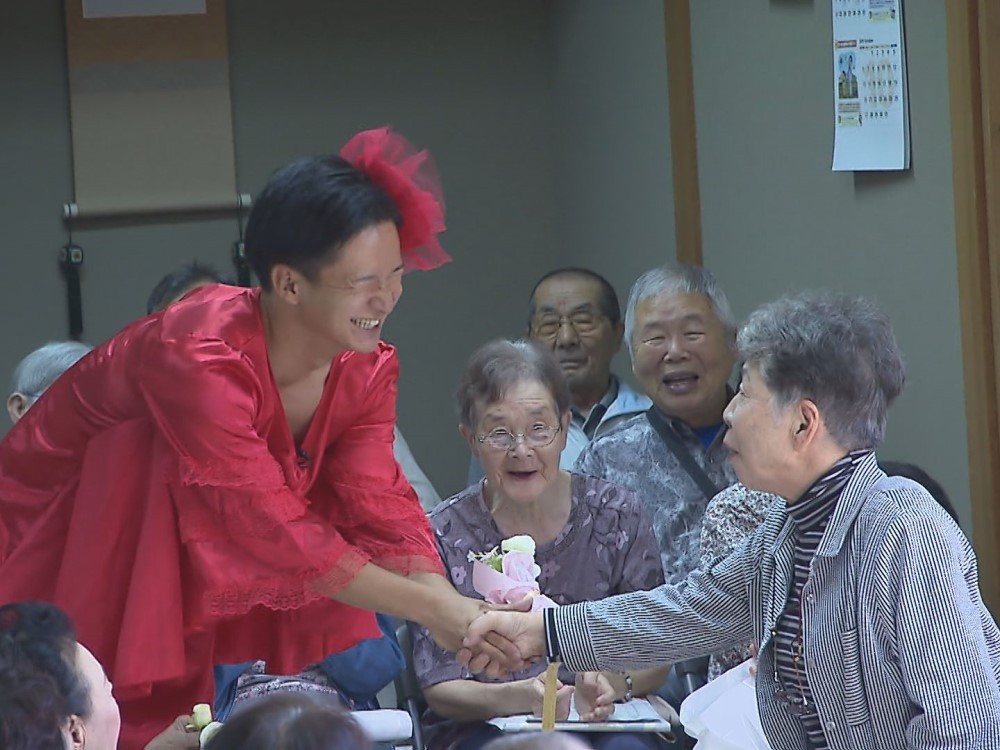 10月、名古屋市北区のコミュニティセンターに集まった大勢の高齢者。そこに現れたのは、真っ赤なドレスに大きな髪飾りをつけた…男性!