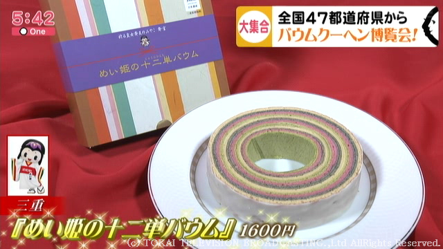 三重からのエントリーは明和町のマスコットキャラクターめい姫の装いを取り入れた『めい姫の十二単バウム』。幾重にも重ねるバウムクーヘンの特徴を生かした仕上がりです。