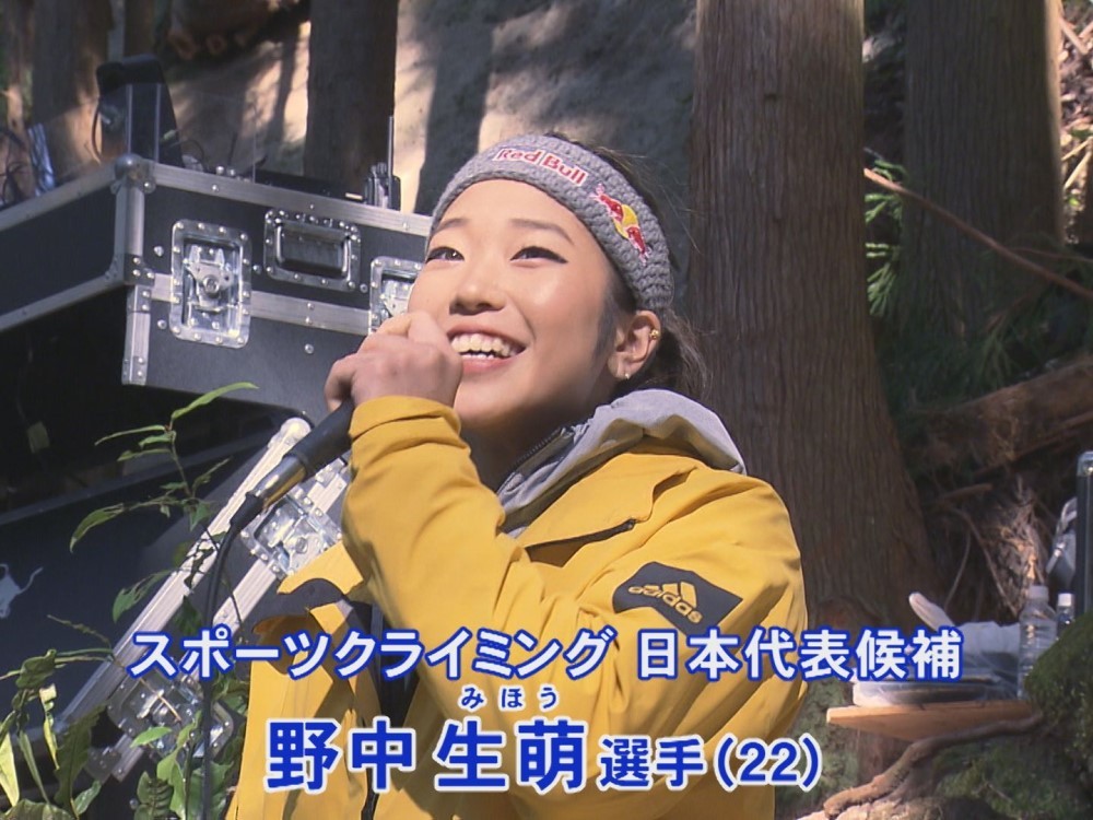 今回、野中選手はゲストとして参加。山からせり出した大きな岩にチャレンジします。腕だけでぶら下がると…そこからジャンプ!岩に吸い付くように登っていきます。