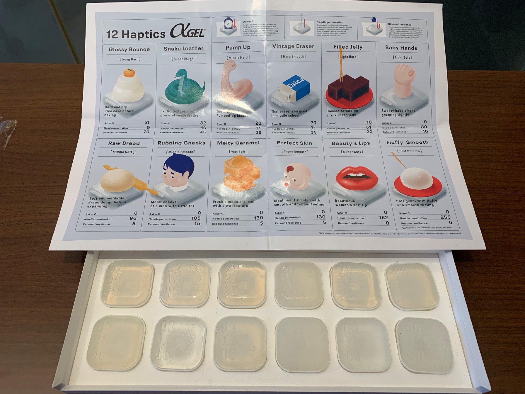 それぞれ柔らかさにあわせて、蛇の皮、消しゴム、赤ちゃんの肌などと似た触感で表現し、わかりやすくパッケージ化することで、商談がスムーズになったという。
