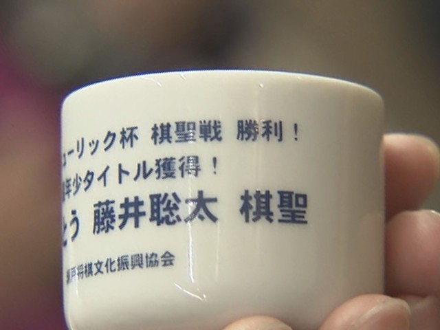 地元からの「棋聖」誕生を祝って、瀬戸らしく「最年少タイトル獲得、藤井聡太棋聖おめでとう」と書かれた瀬戸焼のおちょこの記念品も。