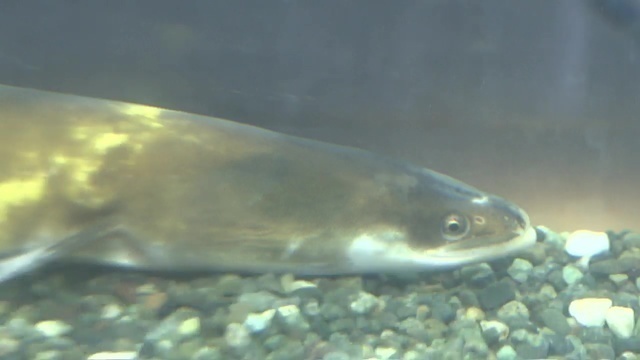 「バナナウナギ」の隣に展示されているウナギは、当初は黒に加えて、オレンジ色と白の3色模様だったそうです。現在はオレンジ色が抜け、白黒の2色になったといいます。