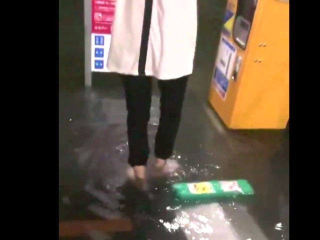 6日午後11時すぎに三重県四日市市で撮影された映像。地面が見えないほど、一面水浸しに。