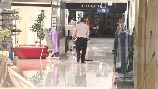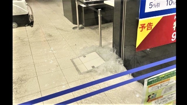 床から店内にあふれ出す水。駅構内と近鉄百貨店が浸水し、片付け作業に追われました。