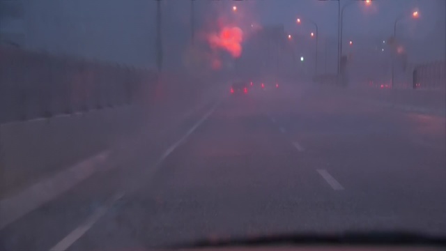 「朝5時半の名古屋市内です。かなり強い雨が降っています。フロントガラスに強く雨が打ち付けています。視界もかなり悪いです」