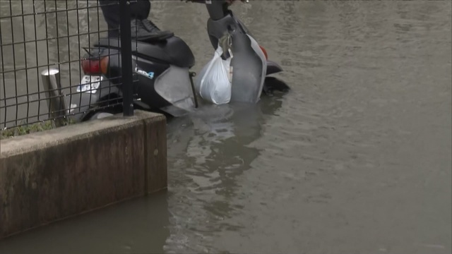 「愛知県稲沢市の三宅川です。橋の近くまで、水かさが増しています。水位20センチほどの普段は鯉の泳ぐ大変浅い川だそうですが、急激に水かさが増しまして、隣の道路にまで水があふれています。住宅地の方まで流れ込み、自転車が水没しています」