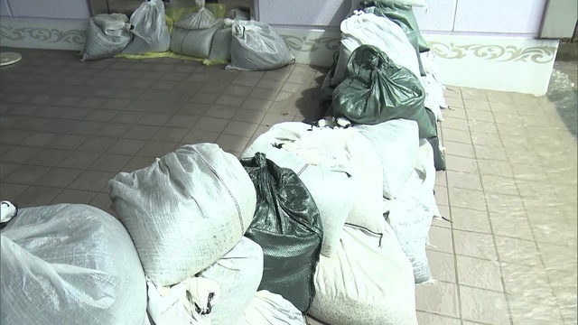 道路沿いの葬儀場のスタッフは、土嚢を積んで入り口に水が入るのを防いでいました。