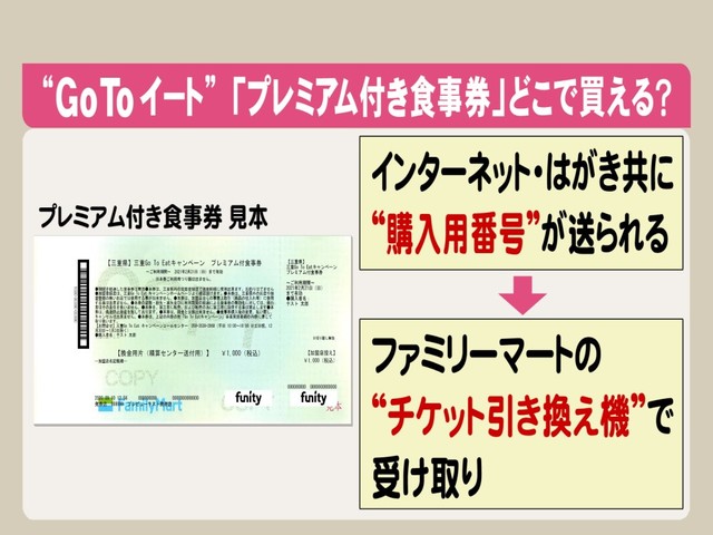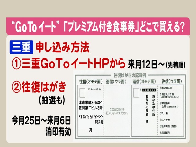 食事券を買う方法は三重の場合、「三重GoToイート」のホームページからの申し込みと、「三重GoToEatキャンペーン事務局(津市栄町3-143-1笠間第二ビル3階)」宛てに往復はがきを送る方法があり、往復はがきの場合は、9月25日から10月6日の消印まで有効で、申し込みが多い場合は「抽選」となります。