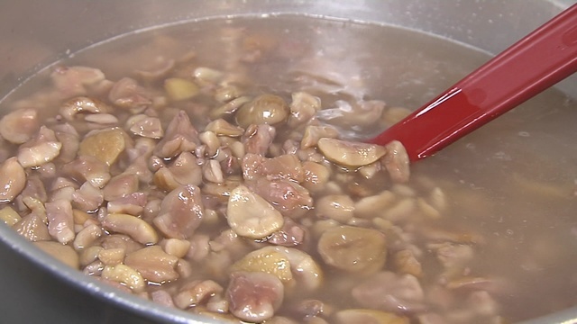 続いては味付け。水に対し40パーセントの砂糖を加え、煮ていきます。糖度は洋菓子としては甘くない30度前後。栗本来の味わいが引き立つよう、甘さはかなり控えめです。
