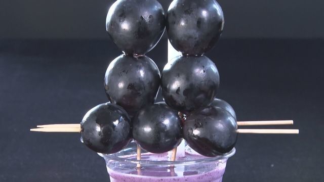 SNSで話題のフルーツがまるごとのったスムージー、更にもう一つ仕掛けがありました。長野産のぶどうをほぼ1パック使い、牛乳、ヨーグルト、オリゴ糖を入れてスムージーに。そこに串に刺したぶどうを積み上げたのが、その名も「ナガノパー子」。