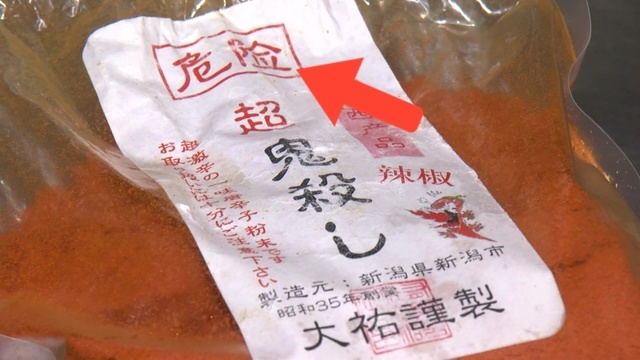 「激辛」に使うのは新潟産の「鬼ころし」というトウガラシ。パッケージには「危険」と書かれています。