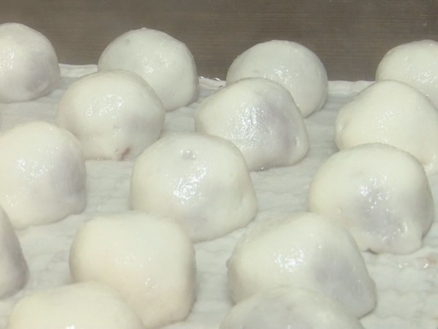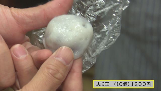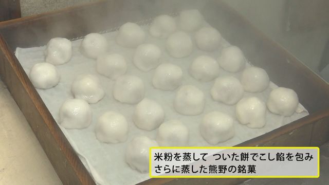 米粉を蒸してついた餅でこしあんを包み、さらにそれを蒸すのが熊野のしらたま。蒸すことでもっちりとしたお餅のような食感になります。