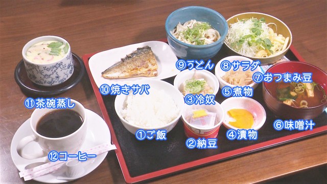 モーニングの「さばセット」は、みそ汁に、納豆や小鉢、うどん、こんがり焼いたサバ、ご飯、それに茶わん蒸しなど全部で12品で400円。