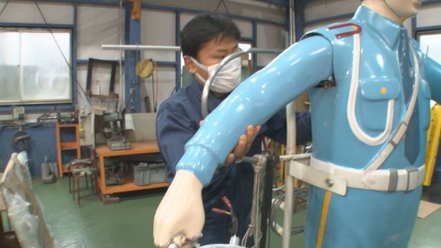 製作に1か月半かかる安全太郎。身長185センチ、体重約40キロ。胴体は、頑丈な強化プラスチック製で、大量生産ではなく、全て社員の手作業で作っています。