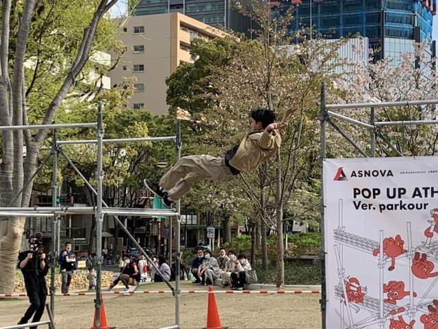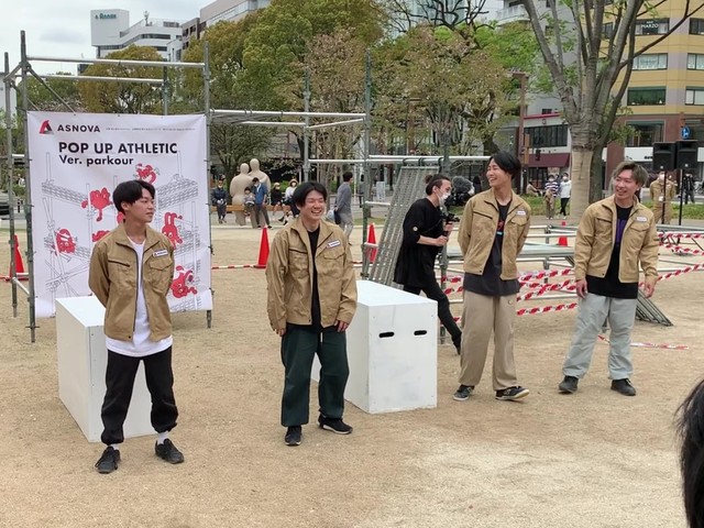パフォーマンスでは、パルクールの日本王者経験もある木本登史さんが所属するプロチーム「SPEMON(すぺもん)」のメンバーで、16歳の高校生から27歳までの6人が、ASNOVAが設置した足場を飛び移ったり、走ったりバク宙するなど自由に動き回り、アクロバティックな技を次々と披露した。