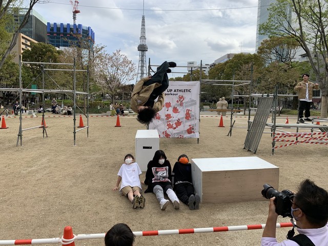 名古屋市中区の「久屋大通パーク」に3日、建設現場で使われる足場が設置され、フランス発祥のスポーツ「パルクール」のパフォーマンスが披露された。