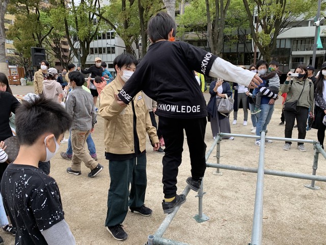 この足場を使ってこのあと披露されたのが、「パルクール」だ。パルクールは、その場所にある障害物などを利用して走ったり、跳んだり、登ったりして移動するスポーツ。フランスの軍隊トレーニングが発祥だが、体だけでなく心も鍛えられるとしてデンマークのように、教育にも取り入れられている国もあるという。