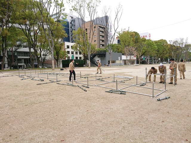 午前8時、名古屋の都心・栄にある久屋大通パークに、作業服を着た大勢のスタッフが集まり、鉄製の長いパイプを次々と繋げて組み立て始めた。