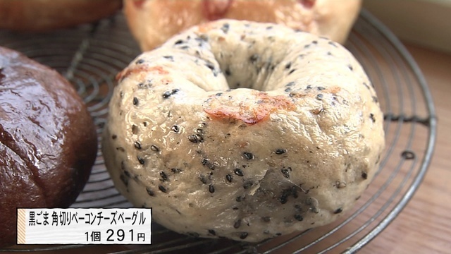 他には無い美味しさと評判のベーグルは、国産の小麦粉と天然酵母で作っています。黒ゴマを生地に練りこんだ「黒ごま角切りベーコンチーズベーグル」(291円)や…。