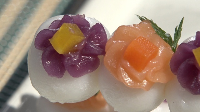 中でも看板メニューが、『カラフル人参だんご』(2本500円)。だんごの上に、白あんで作った餡で花をかたどり、上にはニンジンの甘露煮を乗せました。餡のオレンジ色はニンジンの、紫色には黒ニンジンの果汁を使っています。見た目のインパクトはもちろん、優しい甘さとほのかなニンジンの香りが特徴です。