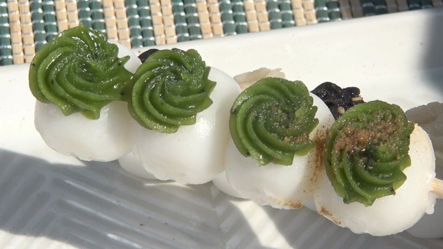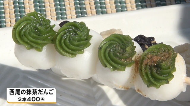 西尾の抹茶を使った餡にきな粉をまぶした「西尾の抹茶だんご」(2本400円)。