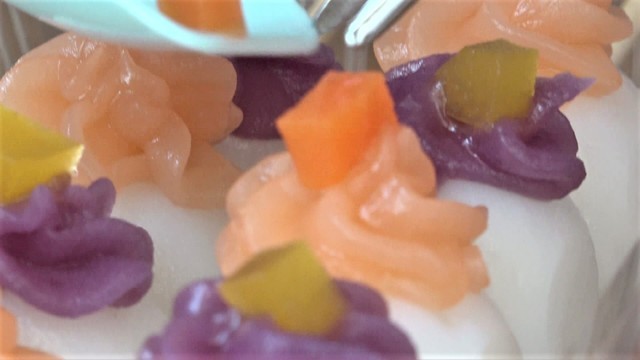 花をかたどったオレンジや紫のクリームに抹茶…。